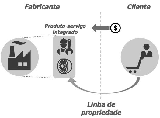 A Figura 2 apresenta a realidade de uma empresa servitizada em última instância – de acordo com o conceito de Schmenner (2009). Nela o papel de intermediários e prestadores de serviços é eliminado, sendo estreitada a relação entre indústria e cliente. Nesse caso, a indústria produz o bem mas não o vende em si, mas sim seus resultados. O cliente então paga pelos resultados oriundos do produto numa nova oferta denominada produto-serviço integrado. Assim, ele já não mais possui propriedade sobre o bem ou responsabilidade por eventuais necessidades adicionais que ele venha a ter, como falhas e modernizações, sendo estas preocupações do fabricante.