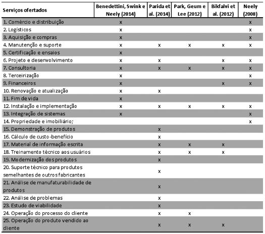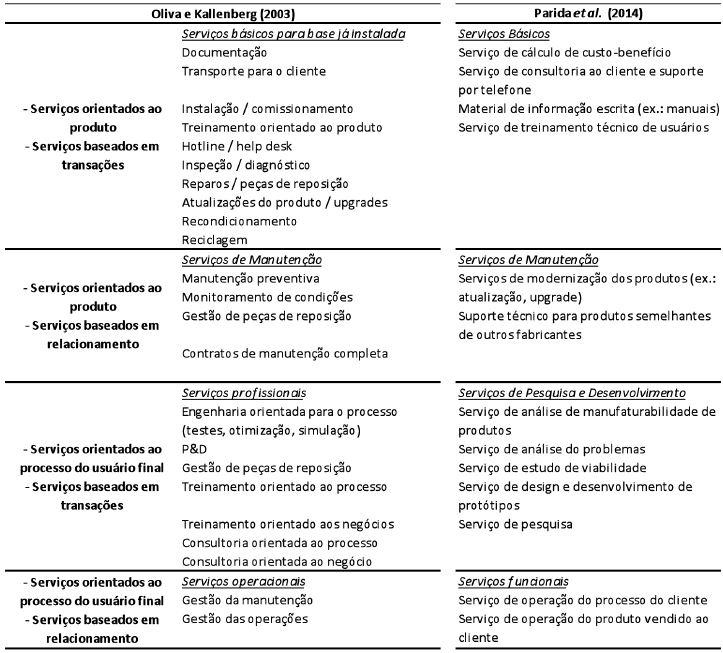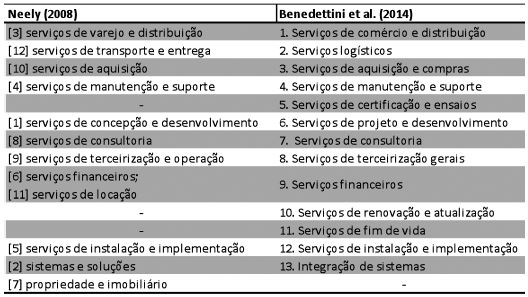 Em termos comparativos, as ofertas destacadas em Benedettini, Swink & Neely (2014) e Neely (2008) apresentam algumas diferenças, conforme evidenciado no Quadro 2.