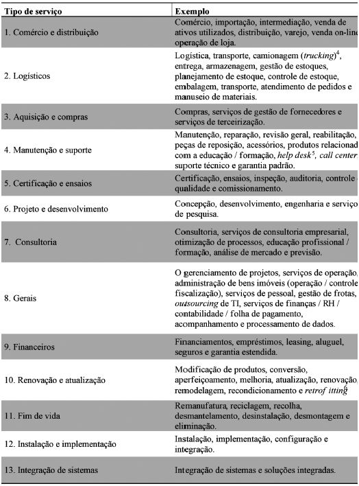 Park, Geum e Lee (2012), em extensa pesquisa na literatura, encontraram diversos exemplos de produto-serviço integrado, tais como: Instalação, treinamento, operação, reparo, manutenção, documentação e consultoria. Em última instância, a indústria vende o uso do equipamento, mas não o vende em si (Schmenner, 2009), como o caso da Xerox, que tem deixado de ser produtora de fotocopiadoras para ser uma empresa de documentos (Bascavusoglu-Moreau & Tether, 2011; Park, Geum, & Lee, 2012). Cita-se ainda, o caso da Rolls Royce, que tem cobrado pelas horas de uso de seus motores de aeronaves ao invés de vendê-los (Bascavusoglu-Moreau & Tether, 2011).