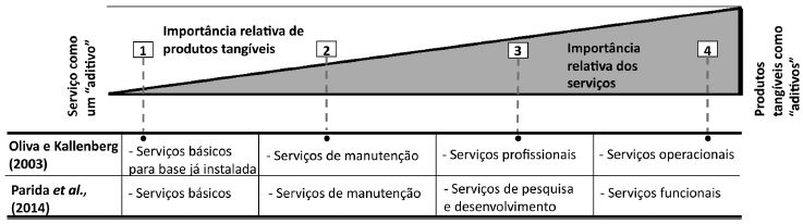 Dentre os modelos de mensuração avaliados, o de Parida et al. (2014) e o de Oliva e Kallenberg (2003) parecem ser os mais congruentes. Esta avaliação reside nos seguintes aspectos: (a) apresentam o mesmo discurso acerca de estágios de negócio, tanto os iniciais (orientados ao produto, devido à maior ênfase no produto em relação aos serviços) quanto os finais (relacionados ao usuário e orientado ao resultado, devido ao maior enfoque em serviços e uma maior responsabilidade assumida pelo fornecedor); (b) os dois modelos se caracterizam por quatro estágios; (c) os nomes de cada um dos estágios são similares; (d) e utilizam serviços similares para exemplificar cada um dos estágios. O Quadro 4 foi construído para sintetizar os serviços destacados por cada um dos autores e para facilitar sua comparação.