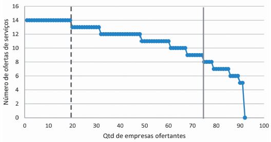 Assim, foram selecionadas as dezenove empresas mais servitizadas (i.e. com maior volume de ofertas), as quais apresentaram um montante de treze a catorze ofertas de serviços. Estas representaram um total de 20,65% da amostra e estão representadas no Gráfico 1 pelo número de empresas à esquerda do corte serrilhado.