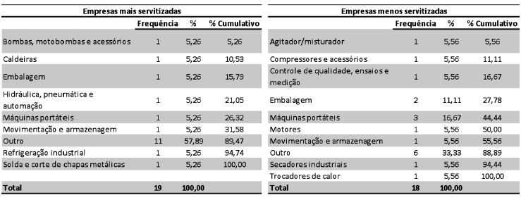 De acordo com a Tabela 3, a principal diferença entre as características das empresas mais servitizadas (parte esquerda da Tabela 3) e a das empresas menos servitizadas (parte direita da Tabela 3) é o primeiro grupo ser caracterizado por empresas atuantes nos seguintes segmentos: (i) bombas, motobombas e acessórios; (ii) caldeiras; (iii) hidráulica, pneumática e automação; (iv) refrigeração industrial; e (v) solda e corte de chapas metálicas; enquanto o segundo grupo é caracterizado por empresas atuantes nos seguintes segmentos: (a) agitador/misturador; (b) compressores e acessórios; (c) controle de qualidade, ensaios e medição; (d) motores; (e) secadores industriais; e (f) trocadores de calor. Os segmentos comuns aos dois grupos foram: Embalagem, máquinas portáteis, e movimentação e armazenagem.