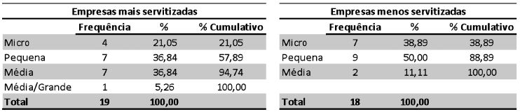 De acordo com a Tabela 4, a principal diferença entre as características das empresas mais servitizadas (parte esquerda da Tabela 4) e a das empresas menos servitizadas (parte direita da Tabela 4) é o primeiro grupo ser caracterizado por empresas de maior porte. Em termos percentuais absolutos, ao caminhar-se do grupo das menos servitizadas para o grupo das mais servitizadas, as microempresas apresentaram um decréscimo de 17,84 pontos percentuais, a pequena empresa um decréscimo de 13,16, a média empresa um acréscimo de 25,73, e a média/grande um acréscimo de 5,26. Não houve nenhuma empresa alocada na categoria de grande empresa.