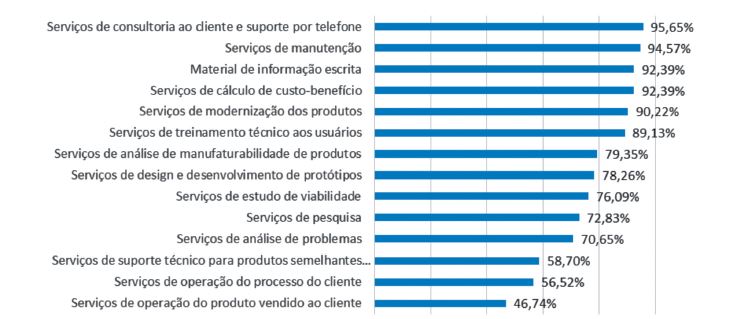 Os resultados mostram que o serviço com maior oferta pelas empresas da amostra foi o de consultoria ao cliente e suporte por telefone (95,65%) e o de menor foi o de operação do produto vendido ao cliente (46,74%).