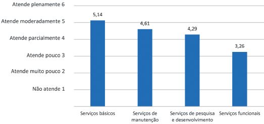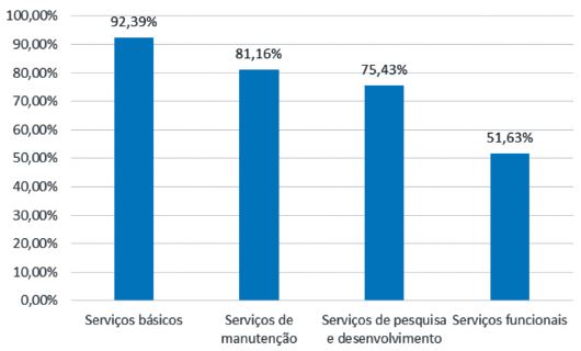 Os resultados mostram que 92,39% da amostra apresentou oferta de serviços básicos, seguindo-se 81,16% de serviços de manutenção, 75,43% de serviços de pesquisa e desenvolvimento e 51,63% de serviços funcionais.