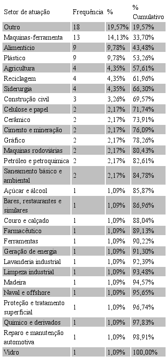 A Tabela 1 discrimina os diferentes setores em que as empresas respondentes atuam, conforme classificação disponibilizada no site da ABIMAQ.