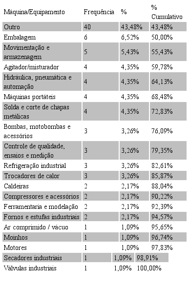 A Tabela 2 discrimina a caracterização da mostra pelo principal tipo de máquina / equipamento fabricado pela empresa respondente, conforme classificação disponibilizada no site da ABIMAQ.