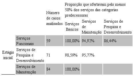 Com o intuito de avaliar a existência de estágios para a servitização, verificou-se a ocorrência de alguma relação entre a oferta de serviços mais avançados e seus predecessores. Para tanto as seguintes ações foram realizadas. Dos noventa e dois casos selecionados, considerou-se como ofertante do serviço, os respondentes que marcaram pelo menos “Atende pouco” na escala de atendimento do serviço. Posteriormente, selecionou-se todas as empresas que ofertassem pelo menos 50% dos tipos de serviços funcionais, isto é, pelo menos um dos dois tipos possíveis utilizados nesta categoria. Em seguida, avaliou-se a proporção de empresas que ofertavam pelo menos 50% dos serviços das categorias predecessoras (serviços de pesquisa e desenvolvimento, serviços de manutenção e serviços básicos).