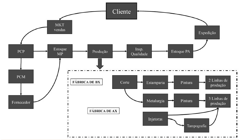 O foco do projeto será na fabricação dos produtos BX que representam 40% do volume da planta. Esta produção possui duas linhas de produção e uma grande variedade de produtos, a demanda se caracteriza como instável tornando a previsão incerta, porém, não há grandes picos ou sazonalidades, nem tendências de crescimento ou de queda, ambiente favorável à utilização da estratégia de planejamento da produção MTA. Atualmente, a parte da fabricação dos produtos BX destinada à exportação é feita com a produção por pedido, que representa no máximo 5% do volume das linhas. Enquanto que a produção de BX nacionais, que representa os outros 95%, é feita por MTS. A Figura 1 apresenta um fluxograma da fábrica com todas as suas operações, tanto para produção de BX quanto de AX.