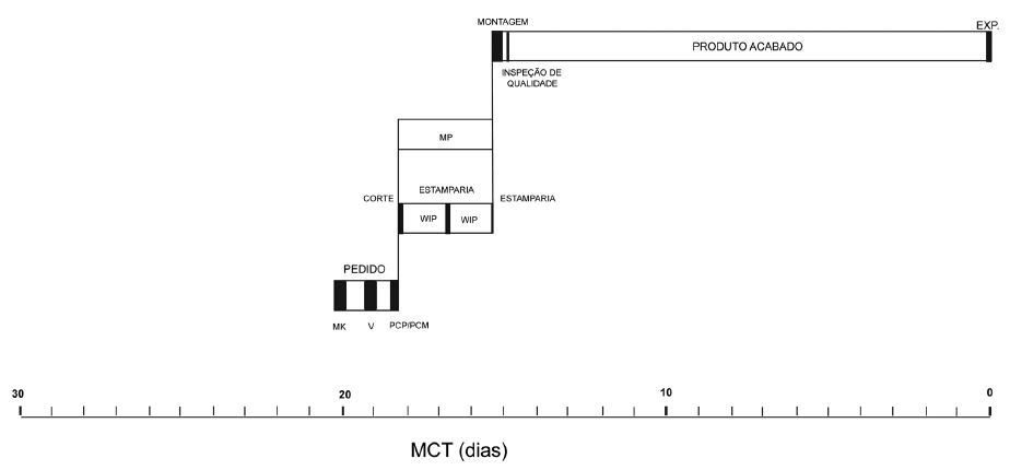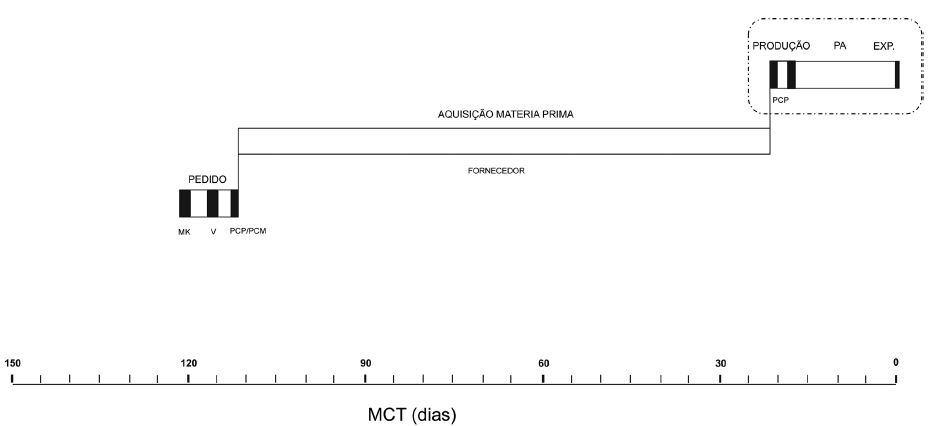 Ao observar o MCT percebe-se que há um processo que ocupa a maior parte do espaço em branco, a aquisição de matéria prima que dura em média 90 dias. Porém, este não faz parte do escopo do trabalho, visto que é um procedimento realizado em uma fábrica filial ao estudo de caso em outra unidade, sem abertura para mudanças serem realizadas. Um segundo MCT então foi feito, nele foi retirado a aquisição de matéria-prima. A Figura 3 representa um MCT simplificado com apenas as partes da operação nas quais foi obtido acesso e abertura para mudança.