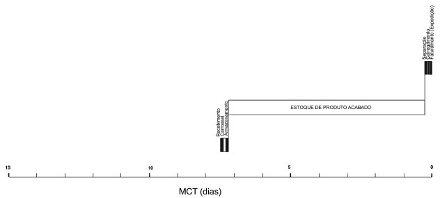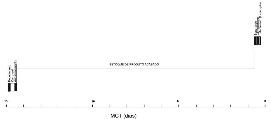 Percebe-se que de um total de 20 dias, pouco mais de 3 dias são os espaços preenchidos, ou seja, espaços que incluem de fato a produção e que não podem ser retirados do processo pois agregam valor ao produto final. Do restante, 14 dias compreendem apenas o estoque acabado, esta quantidade é representada pelo maior espaço em branco. Assim, utilizando o MCT como métrica, definiu-se que o estoque de produtos acabados é onde deverá ser despendido maiores esforços para reduzir o lead time do processo. A Figura 4 representa de forma mais detalhada o MCT do foco do trabalho de redução de lead time, localizado no centro de distribuição da empresa.