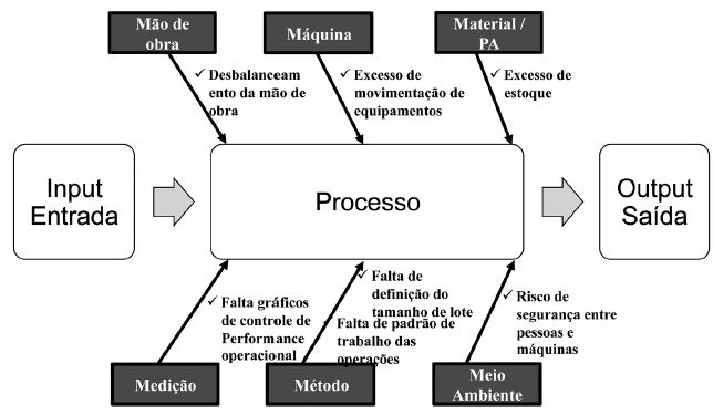 Após análise do MCT, uma segunda visita foi feita no centro de distribuição com o objetivo de conhecer o processo de estocagem e identificar as oportunidades de redução do lead time. Utilizando a ferramenta diagrama de causa e efeito, representado na Figura 5, juntamente com o supervisor da área, foram identificados sete possíveis problemas que afetam o lead time total do processo, são eles: o desbalanceamento da mão de obra; excesso de movimentação de equipamentos; excesso de estoque; falta gráficos de controle de performance operacional; falta de definição do tamanho de lote; falta de padrão de trabalho das operações e o risco de segurança entre pessoas e máquinas.