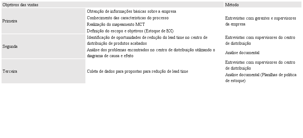 Durante o estudo, ocorreram três visitas técnicas, cujos objetivos foram detalhados no Quadro 1. Como parte da coleta de dados, foram realizadas entrevistas com gerentes e supervisores de produção, e análise de planilhas para se conhecer o processo atual de política de estoque e futuramente propor uma nova com foco na redução de lead time.