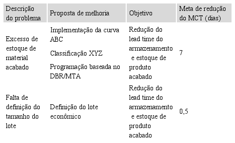Os problemas foram listados em um plano de ação com uma possível redução de dias no MCT. Aquele que tinha maior oportunidade de reduzir lead time no centro de distribuição foi o excesso de estoque, conforme detalhado no Quadro 2, com uma possibilidade de redução de 7 dias no tempo total do MCT. Para tanto, a seguinte proposta foi definida: uma nova programação baseada na estratégia de produção MTA com a implementação da curva ABC e classificação XYZ na definição do estoque. A proposta será detalhada no tópico 4.4.