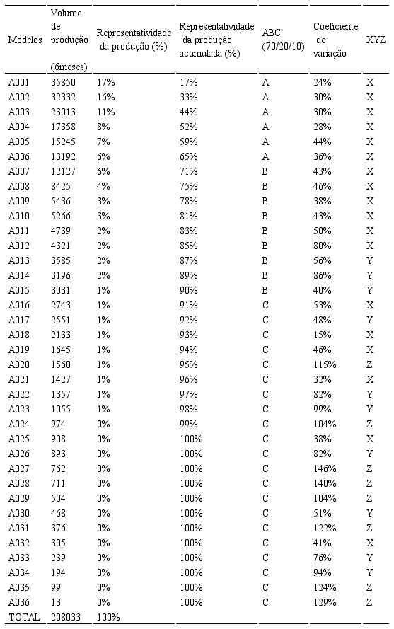 Ainda nesta etapa também foi utilizada a classificação XYZ, que por sua vez, consistia em representar a variabilidade dos últimos seis meses na produção dos modelos. Para isso, foi calculado o coeficiente de variação de cada modelo (sexta coluna na Tabela 1), que consiste na divisão do desvio padrão da produção dos últimos seis meses pela média da sua produção. Nesta classificação foram consideradas no grupo X aqueles com coeficiente de variação até 50%; Y aqueles com coeficiente de variação entre 50 e 100%; Z: aqueles com coeficiente de variação acima de 100%.