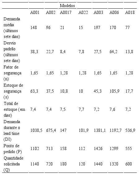 Após cálculo do estoque de segurança, o próximo parâmetro definido é o ponto de pedido (P), que está relacionado com o nível de serviço. O DI consiste na soma da demanda dos sete dias e juntamente com o estoque de segurança define o ponto de pedido (P). A Quantidade de pedido (Q) foi definida conforme o lote econômico já utilizado pela fábrica (60 unidades) e entrou como um múltiplo da maior quantidade considerada no estoque, o ponto P, resultando nos dados apresentados na Tabela 2.