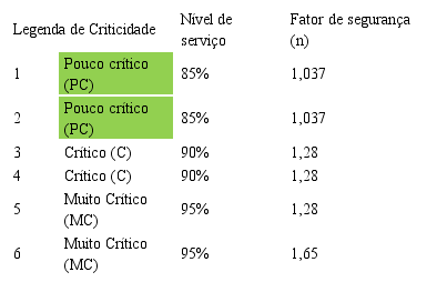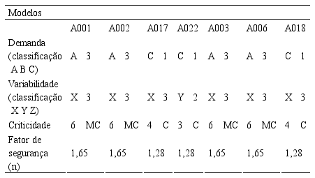 Na Tabela 2, apresenta-se o correspondente à demanda média dos últimos sete dias e seu desvio padrão que servirá de base para cálculo do estoque de segurança (s), que consiste na multiplicação do desvio padrão com o fator de segurança. O nível de serviço foi calculado conforme uma análise de criticidade calculada pela classificação ABC/XYZ representada na Tabela 1. A análise de criticidade é representada na Tabela 3 e classifica cada modelo como muito crítico, crítico ou pouco crítico. Esta classificação determina o nível de serviço necessário e o fator de segurança, considerando que a demanda segue uma distribuição normal.