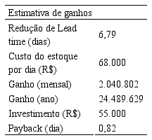 Os ganhos estipulados para essa nova política são de 6,79 dias. Considerando um custo de estoque diário de R$68.000,00, estima-se que anualmente o ganho seja de aproximadamente R$24 milhões, conforme Tabela 4, com um investimento de 55 mil por ano de readequação do layout.