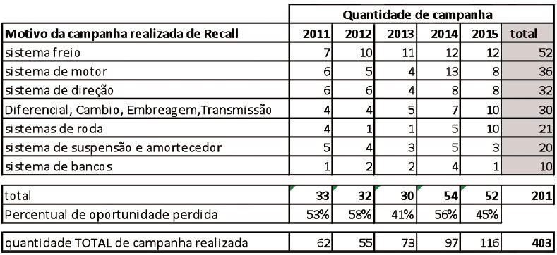 Segundo dados do PROCON (2016), de 2011 a 2015, foram realizadas 403 campanhas de Recall, sendo que, pelo menos 201 dessas campanhas, foram iniciadas por defeitos técnicos de componentes. O quadro 1 demonstra esses números em detalhe.