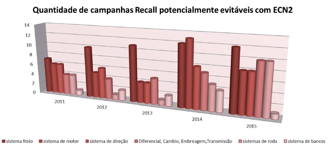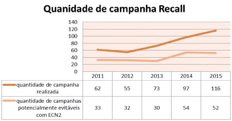 Uma ferramenta disponível para as montadoras agirem em contenção, para bloquear defeitos técnicos de componentes ainda em seus fornecedores, é a implementação de um sistema de Embarque Controlado Nível 2 (ECN2), dessa forma, todas as peças, suspeitas de irregularidades, passam por um processo de rigorosa seleção e, somente peças aprovadas, seguem embarque, rumo à montadora (Elbern, 2012). A figura 4 mostra a quantidade de campanhas de Recall que foram realizadas nos últimos cinco anos, assim como a quantidade de campanhas específicas por defeitos técnicos, sendo esse tipo de defeito possível de se impedir em um processo de ECN2, com grande potencial de ter sido evitado se houvesse a aplicação de um ECN2 eficaz (PROCON, 2016).