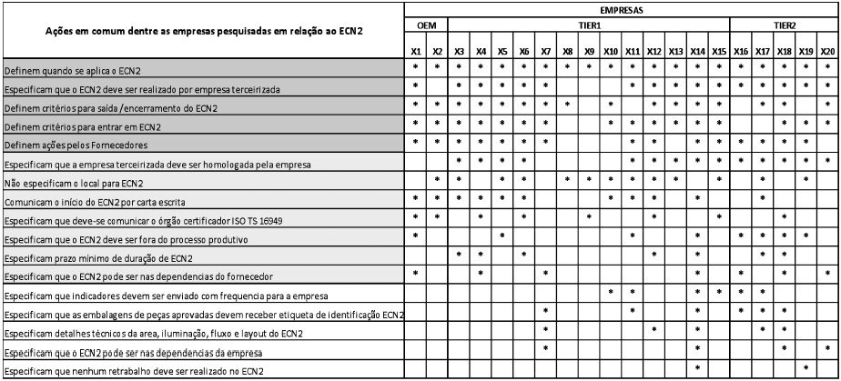 O cruzamento dentre todos os manuais da qualidade das empresas, estudadas, resultaram em 17 ações em comum. Estas 17 ações, multiplicadas pelas 20 empresas, resultaram em 340 campos de possibilidades. Desse total, 174 foram preenchidos, resultando em 51% de padronização, sendo 47% OEM; 50% TIER1 e 56% TIER2.