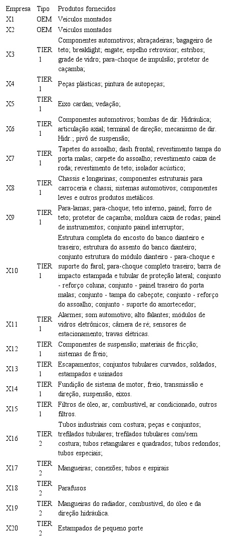 O quadro 3 apresenta as empresas estudadas, com codinomes numéricos sequencial, seguido de um “X”, para preservar os nomes das empresas. É, também, fornecido um resumo de seus principais produtos, além da identificação do tipo de empresa, se é OEM, TIER1 ou TIER2.