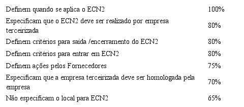 As características, mais citadas, nos manuais da qualidade das empresas, para aplicação de um ECN2, estão descritas no quadro 5, com a porcentagem de empresas estudadas. Pode-se observar que todas se preocupam em definir quando se aplica um ECN2. A maioria determina que este serviço deve ser realizado por empresa terceirizada, além de definir critérios para o encerramento do ECN2. Os critérios para entrar, permanecer e sair do ECN2 devem ser bem claros, e 80% das empresas especificam. As ações a serem realizadas pelos fornecedores tais como corretivas, são definidas por 75% das empresas, sendo este item crucial para o bom desempenho e da garantia da qualidade, além de ações na causa raiz do problema. Quanto a homologação das empresas terceirizadas a realizar o ECN2, 70% das empresas especificam a necessidade de homologarem. Isso permite que empresas desqualificadas realizem este serviço de ECN2, tornando todo o processo instável, já que o prestador de serviço contratado, se não homologado pela empresa, pode realizar o ECN2 sem padrão adequado de modo a garantir a qualidade dos serviços. O local de realização do serviço de ECN2 não é especificado por 65% das empresas, ou seja, pode ser nas dependências do fornecedor, da empresa terceirizada, ou até mesmo no cliente, isso deve ser definido antes de inicio das atividades.