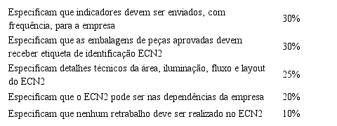 Um dado importante é a área de inspeção, layout e logística do processo. Apenas 25% das empresas determinam detalhes técnicos a respeito da área. 20% das empresas especificam que o ECN2 pode ser nas dependências das mesmas. Somente 10% das empresas proíbem realização de retrabalho no posto de ECN2.