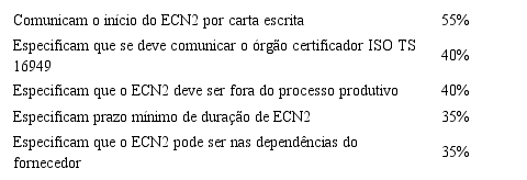 A formalização do inicio do ECN2 é realizada por 55% das empresas. Apenas 40% tem a tratativa de comunicar o órgão certificador ISO TS 16949, o que deveria ser algo aplicável a 100%, sendo que a própria ISO TS 16949 determina a realização do ECN2. Já a realização do processo de ECN2 dentro do processo produtivo pode ser totalmente corrompido em função das pressões de cobrança de volume de itens, e somente 40% especificam que deve ser realizado fora deste processo.