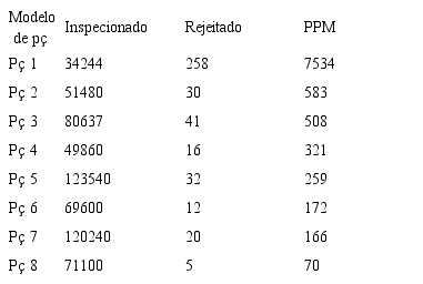 Em 2016, a empresa inspecionou 8 tipos de peças automotivas, no processo de ECN2. Os dados na Tabela 1 apresentam os valores referentes do período de Janeiro/2016 a Dezembro/2016. Todas as peças são para fornecimento direto à montadora de veículos.