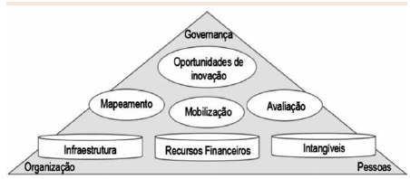Conforme a figura 1, dentro de uma estrutura que contempla a organização, as pessoas componentes e a governança, os recursos intangíveis, financeiros e infraestrutura são a base para a inovação, considerando que a inovação surge de oportunidades, e as oportunidades são resultado de avaliação, mobilização e mapeamento. Nos casos de avaliação e mapeamento, os recursos intangíveis são essenciais, onde o conhecimento é o orientador dos processos, enquanto na mobilização são os recursos financeiros que atuam diretamente e fica a cargo da infraestrutura receber a todos os processos. (Quadros, 2008 como citado em Macul, 2012, p. 11).