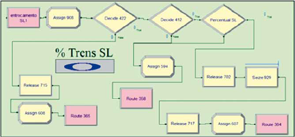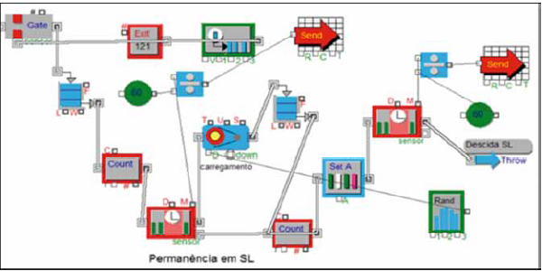 No caso do software proposto, Arena 14, a modelagem foi feita em uma parceria da equipe de engenharia da área com a representante do software no Brasil e a coleta de dados feita exclusivamente pela área. A interface do modelo de simulação é apresentada na figura 4, onde, por sua vez, pode se verificar a simplicidade do modelo em relação ao demonstrado anteriormente para a mesma utilização.