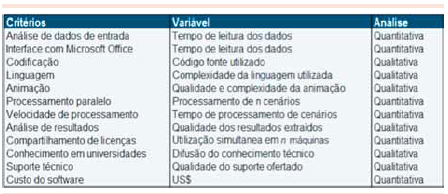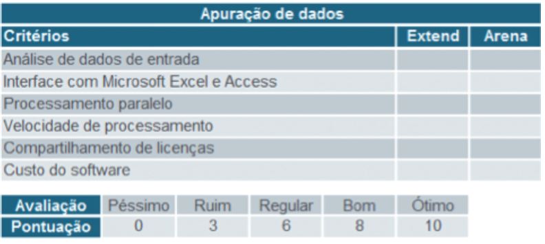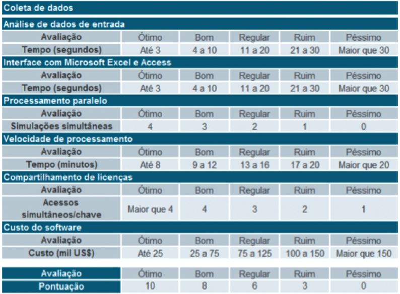 O estudo teve início durante o desenvolvimento do Plano de Capacidade Logística (PCL), que considera premissas operacionais advindas do setor de Engenharia, Diretoria de Operações, Diretoria da Mina e relatórios de Oferta x Demanda (OxD) da Diretoria Comercial, a fim de elaborar e revisar o plano de produção plurianual (5 anos seguintes), orçamento (ano seguinte), programa (ano, mês, semana e dia corrente). Foi constatada lentidão na ferramenta de processamento dos inputs, incompatível com o tempo disponível para a execução das atividades, de modo que o setor responsável por esse planejamento necessitara passar a fazer um elevado número de horas extras para a entrega de cada plano solicitado. Para o desenvolvimento do instrumento de coleta de dados a ser utilizado foram definidas as variáveis a serem medidas conforme as prioridades da área. Os critérios de avaliação podem ser observados no quadro 3.