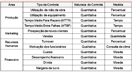 Os tipos de controle concentram-se em variáveis específicas para o acompanhamento do desempenho. Quanto à natureza do controle, pode ser qualitativa ou quantitativa, para Dalfovo (2008, p. 7) a primeira “caracteriza-se pelo emprego da quantificação, tanto nas modalidades de coleta de informações, quanto no tratamento dessas através de técnicas estatísticas”, enquanto a segunda “não emprega um instrumental estatístico como base na análise de um problema, não pretendendo medir ou numerar categorias”. As unidades de medida seguem uma padronização global, no caso das quantitativas, mas são específicas para cada medição que se deseja obter.