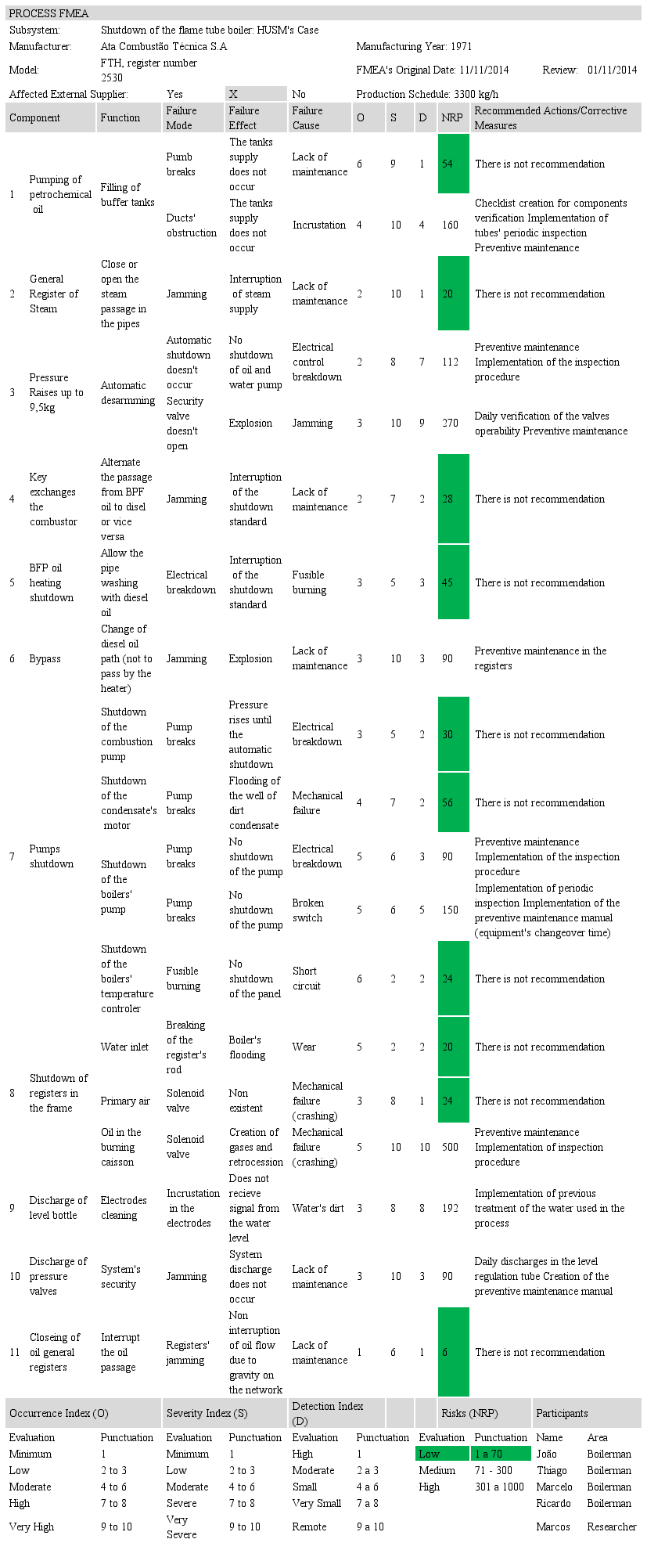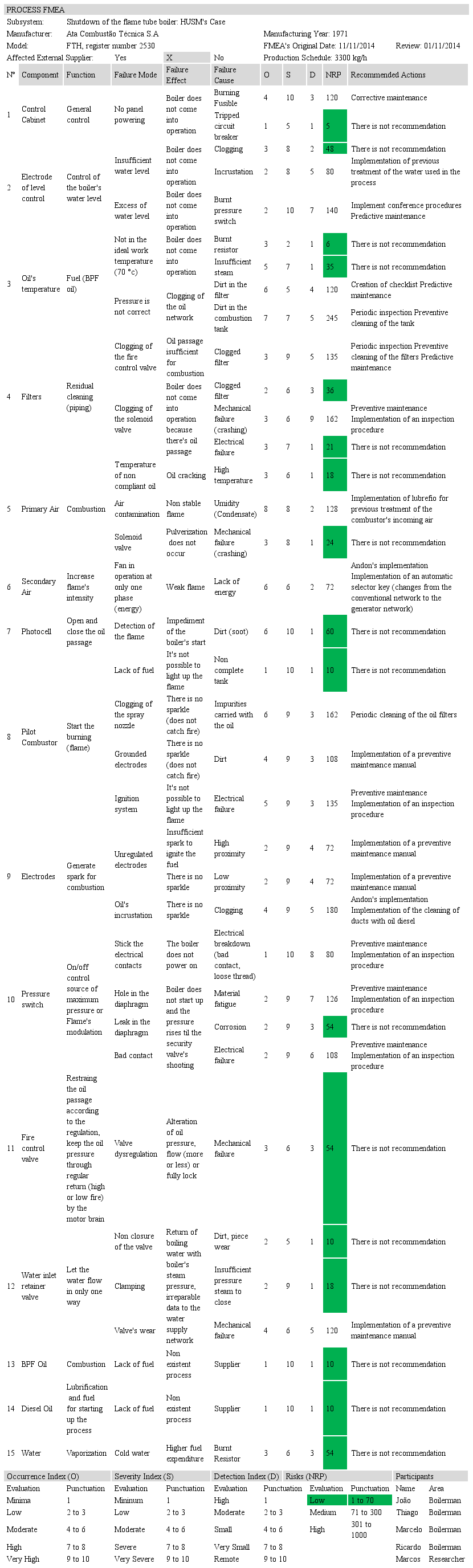 According to Fogliatto and Ribeiro (2009), for FMEA’s monitoring is necessary to understand the technique as a dynamic document that should reflect the latest versions of the process, as well as the latest actions taken, including changes adopted after the production start. FMEA is applied to map the possible failure modes and effects from an item – in this case study, the flame tube boiler. In order to clarify the criteria for determining the indexes of occurrence (O), severity (S) and detection (D), Table I shows the indicators used in the application of FMEA.