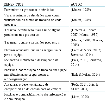 Portanto, são notórios os benefícios que o kanban proporciona quando bem implantado e adequado à realidade das diversas organizações que almejam por melhorias em seus processos, segundo a literatura. O quadro 1 apresenta os principais benefícios que são ressaltados na literatura: