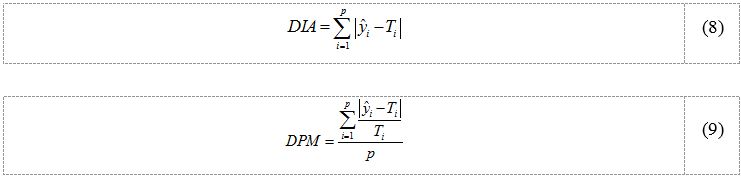 Para se proceder a uma comparação dos métodos numa base eqüitativa, dado que a função utilidade global não tem a mesma forma em todos eles, o desempenho dos métodos foi avaliado com base em medidas de desempenho apresentadas por Xu, Lin, Tang, e Xie (2004). Essas medidas, denominadas de Distância Absoluta (DIA) e Desvio Médio Percentual (DPM), são definidas em (8) e (9), respectivamente.