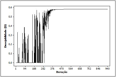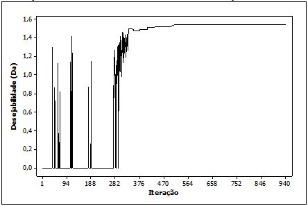 A utilização da função Desirability como função aglutinadora, conforme observado na Tabela 6, demonstra um desempenho inferior à função Desirabilty adaptada. Pode-se observar também que neste estudo de caso a função aglutimadora influencia mais na obtenção da melhor configuração de processo do que o método de busca empregado.