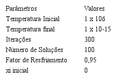Os parâmetros empregados no algoritmo do Recozimento Simulado, para todos os estudos de casos realizados neste trabalho, estão descritos na Tabela 1. A escolha dos parâmetros foi realizada através de um método de calibração para o Recozimento Simulado descrito por Gomes (2015).