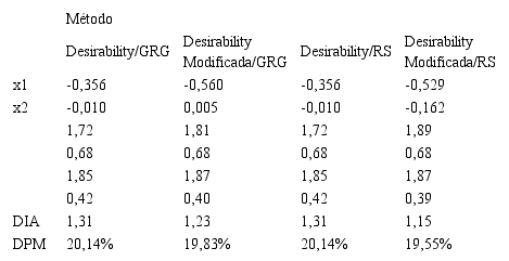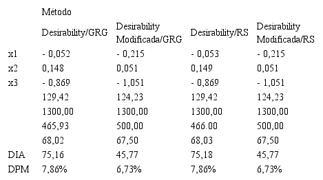 Neste estudo de caso, ao analisar a Tabela 4, nota-se que a combinação da função aglutinadora Desirability Modificada e a metaheurística Recozimento Simulado utilizada como método de busca, obtiveram o melhor desempenho comparado ao demais métodos utilizados neste trabalho. Deve-se ressaltar também que o ajuste proposto utilizando a função aglutinadora Desirability não sofre interferência do método de busca, entretanto, no caso da função Desirability Modificada, há uma diferença entre os pontos selecionados como melhor ajuste quando utilizamos o GRG e a metaheurística Recozimento Simulado como métodos de busca. A ocorrência deste fato pode ser explicada pela limitação que o GRG encontra em escapar de pontos de mínimos locais, não sendo o método mais apropriado para se encontrar o mínimo global.