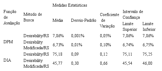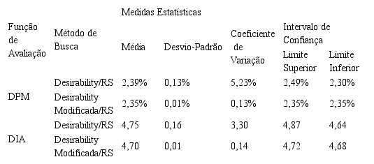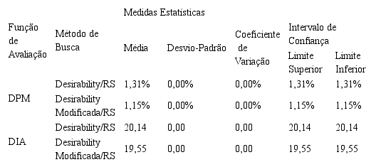 Os resultados sumarizados na Tabela 7, demonstram que a função aglutinadora Desirability gera uma variabilidade maior nas respostas encontradas em comparação com a função aglutinadora Desirability adaptada, quando utilizada a metaheurística Recozimento Simulado como método de busca. Tal comportamento não é observado nos demais casos analisados neste trabalho, o que indica que a variação presente nas respostas seja uma particularidade deste caso. Porém, tal variabilidade não é grande o suficiente para se demonstrar a necessidade de réplicas na utilização da metaheurística Recozimento Simulado.