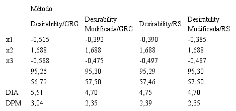 De acordo com Xu et al. (2004), quanto menores forem os valores de DIA e DPM, melhor será o desempenho do método, ou seja, mais próximo do valor alvo estarão todas as respostas.