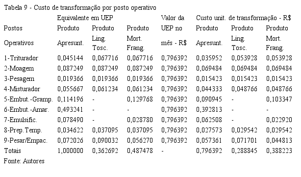 Portanto, o custo unitário de transformação por posto operativo foi apurado através da multiplicação da equivalência em UEP do produto em cada setor pelo valor da UEP no mês. Por exemplo: no que concerne ao produto “Apresuntado”, no posto operativo “1-Triturador” este consumiu 0,045144 UEP, cujo valor foi multiplicado por R$ 0,796392 (valor da UEP no mês) para mensurar o custo unitário de transformação nesta etapa fabril (R$ 0,035952). Procedimento idêntico foi aplicado aos demais produtos, como consta da Tabela 9.