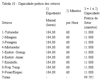 Considerando que cada setor tinha expediente mensal de 184,80 horas, apurou-se que a capacidade prática destes seria, respectivamente, de 11.088 minutos por mês. Em virtude disso, a capacidade prática mensal de todos os setores desta linha de produção da indústria totalizava 99.792 minutos.
