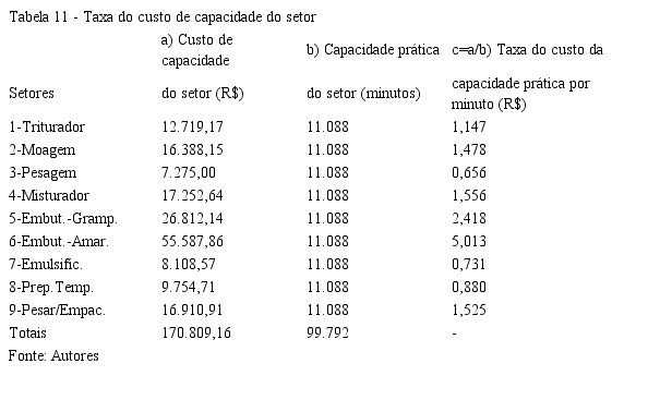 O segundo passo do TDABC requer a definição do valor monetário (R$) da taxa do custo de capacidade de cada um dos setores abrangidos, conforme demonstrado na Tabela 11.