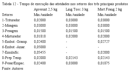 Depois de fazer esse cálculo para todos os setores, passou-se para a fase de obtenção do tempo de execução de cada atividade realizada nos setores, como relatado na Tabela 12.