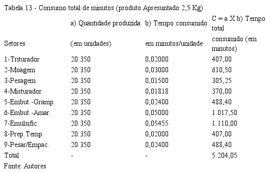 Com base nos dados disponíveis acerca do tempo de execução e da quantidade de produtos fabricados foi determinado o tempo total consumido (em minutos) para cada um dos setores e respectivos produtos. Nesse rumo, na Tabela 13 está representado esse cálculo para o produto “Apresuntado 2,5 Kg”, a título de exemplo.
