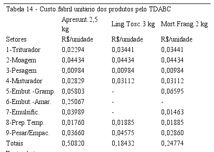 O passo posterior da aplicação do método TDABC refere-se à determinação do custo fabril unitário dos produtos abrangidos no estudo, cujos resultados dos três principais estão expostos na Tabela 14.
