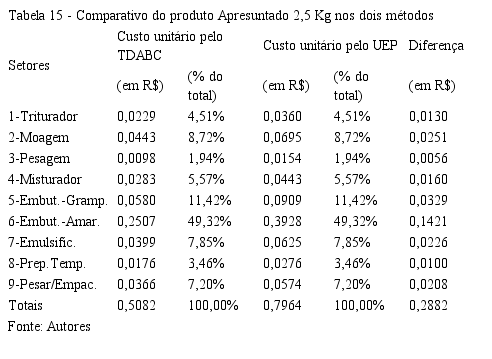 Após a conclusão das etapas de cálculos do TDABC e UEP, passou-se para a fase de comparar os resultados apurados nas duas metodologias de custeamento. Para tanto, na Tabela 15 constam os valores relacionados ao produto “Apresuntado 2,5 Kg” como forma de facilitar a análise dos resultados obtidos na pesquisa.