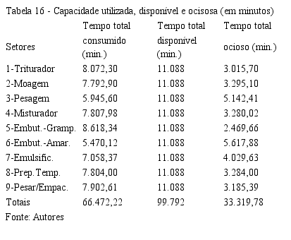 Os métodos UEP e TDABC possibilitam a adoção de indicadores da performance fabril relacionados com a ociosidade dos equipamentos. No caso do TDABC, a mensuração desses índices passa inicialmente pela definição das capacidades disponível, consumida e ociosa dos setores, como reproduzido na Tabela 16.